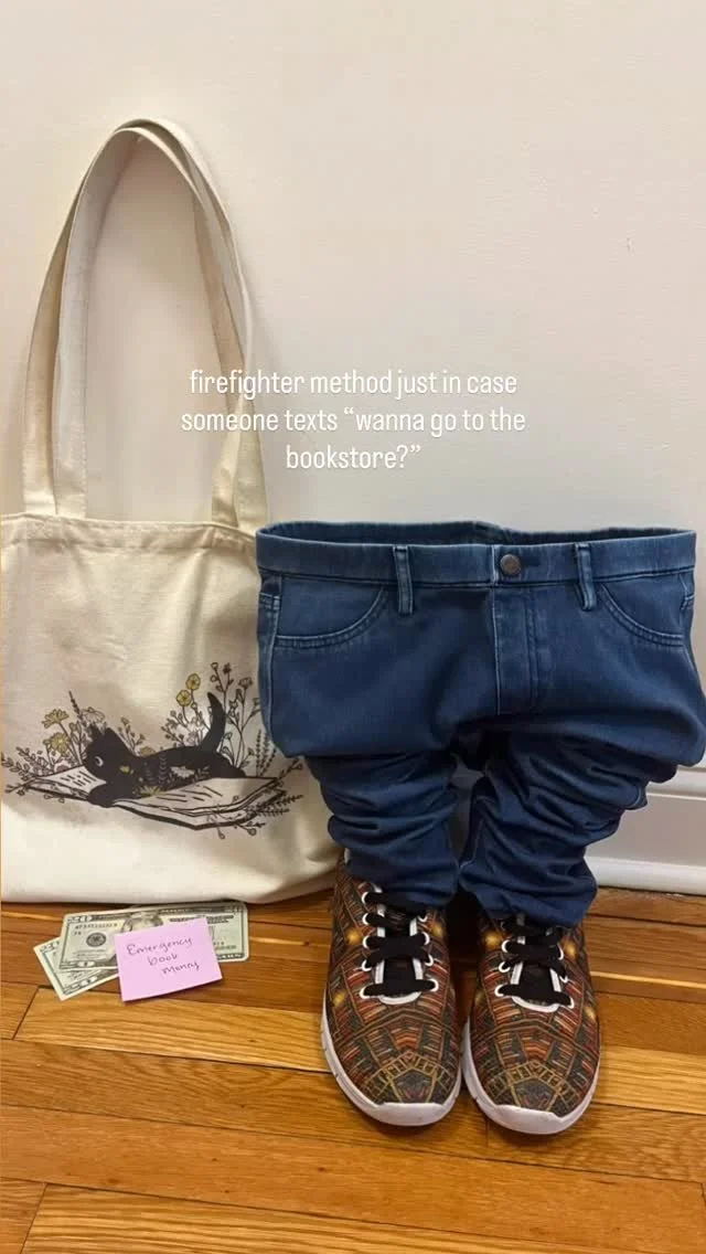 Emily leans over a stack of book, surrounded by stacks of books. She is wearing purple and smiling.